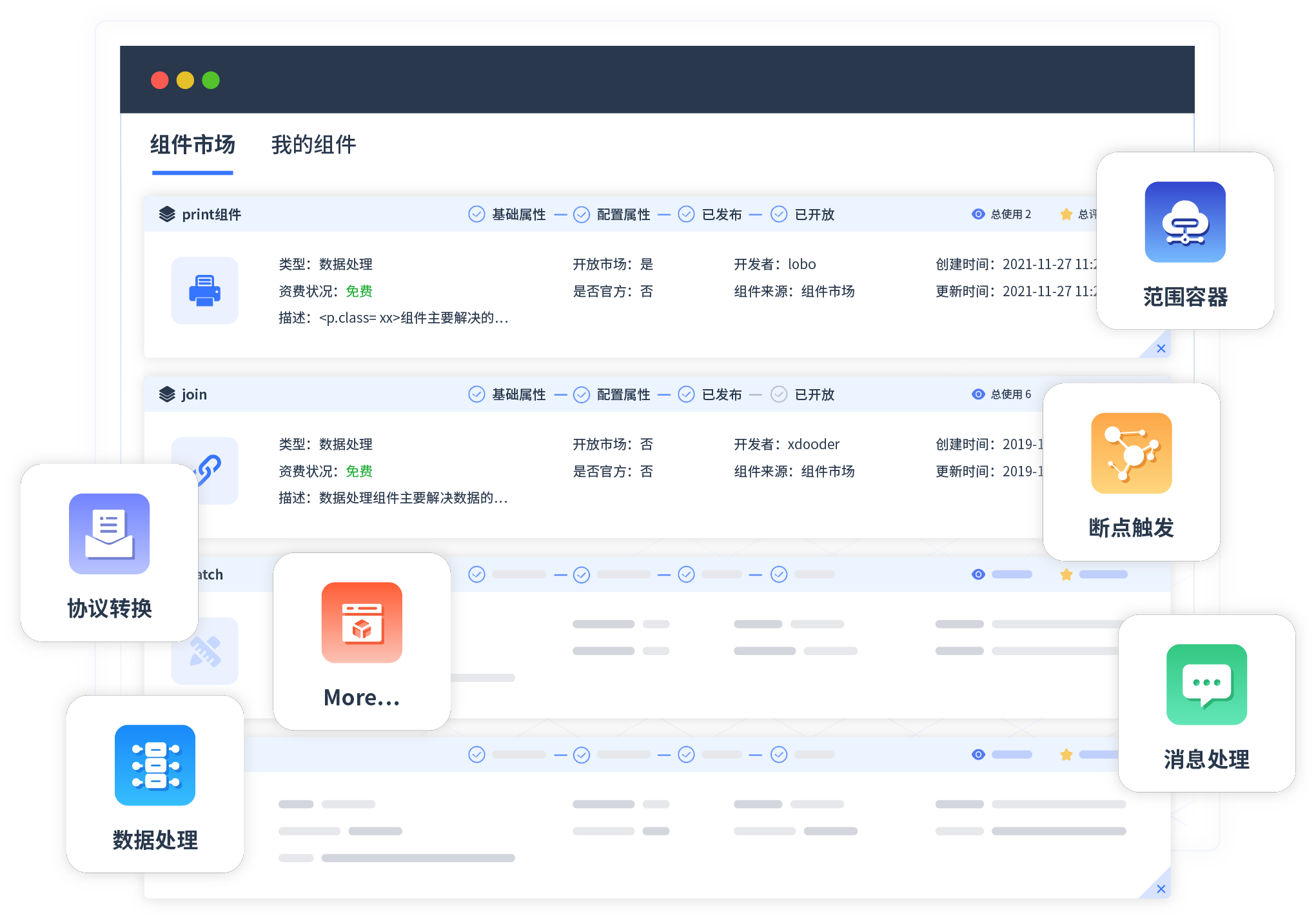 针对集成场景,,,,钱能钱包提供组件市场,,例如协议转换、、、、消息处理、、、、文件操作等。。除平台提供的组件外,,,客户可以自定义所需组件。。。。