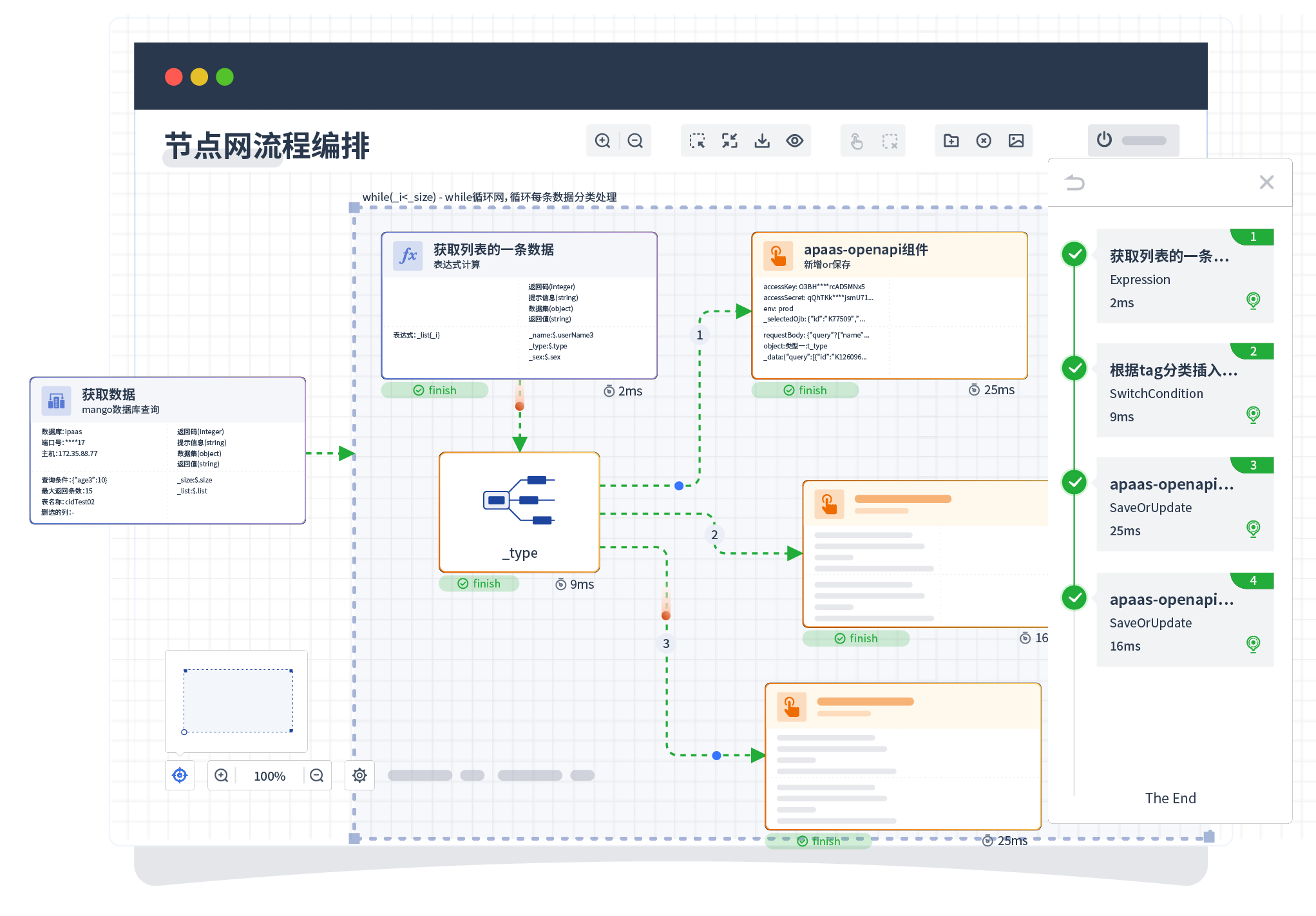 针对集成场景,,组件定义后支持进行流程编制,,不同于传统代码方式,,,通过图形化展示,,,,支持在线调试、、、、日志查看和运行回放。。。