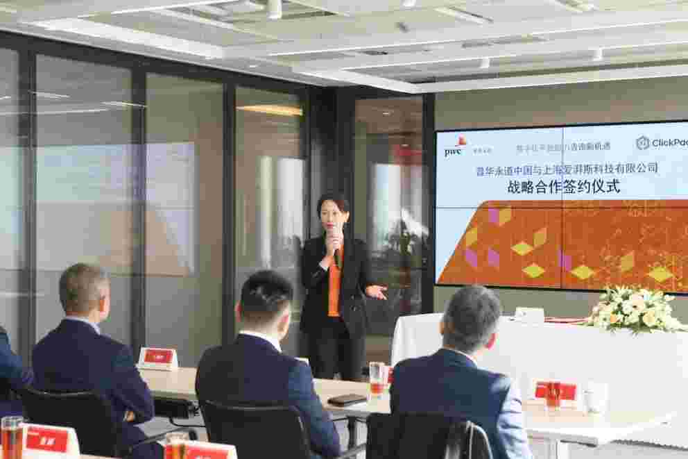普华永道中国风险及控制服务数字化鉴证和分析服务主管合伙人吕麟晖与钱能钱包首席产品官马俊代表双方签订战略合作协议,,,,普华永道中国上海主管合伙人黄佳与钱能钱包创始人、、CEO胡柏见证战略合作协议签订过程。。普华永道中国创智中心合伙人林榕作为项目总负责人主持并见证了本次战略合作签约仪式。。