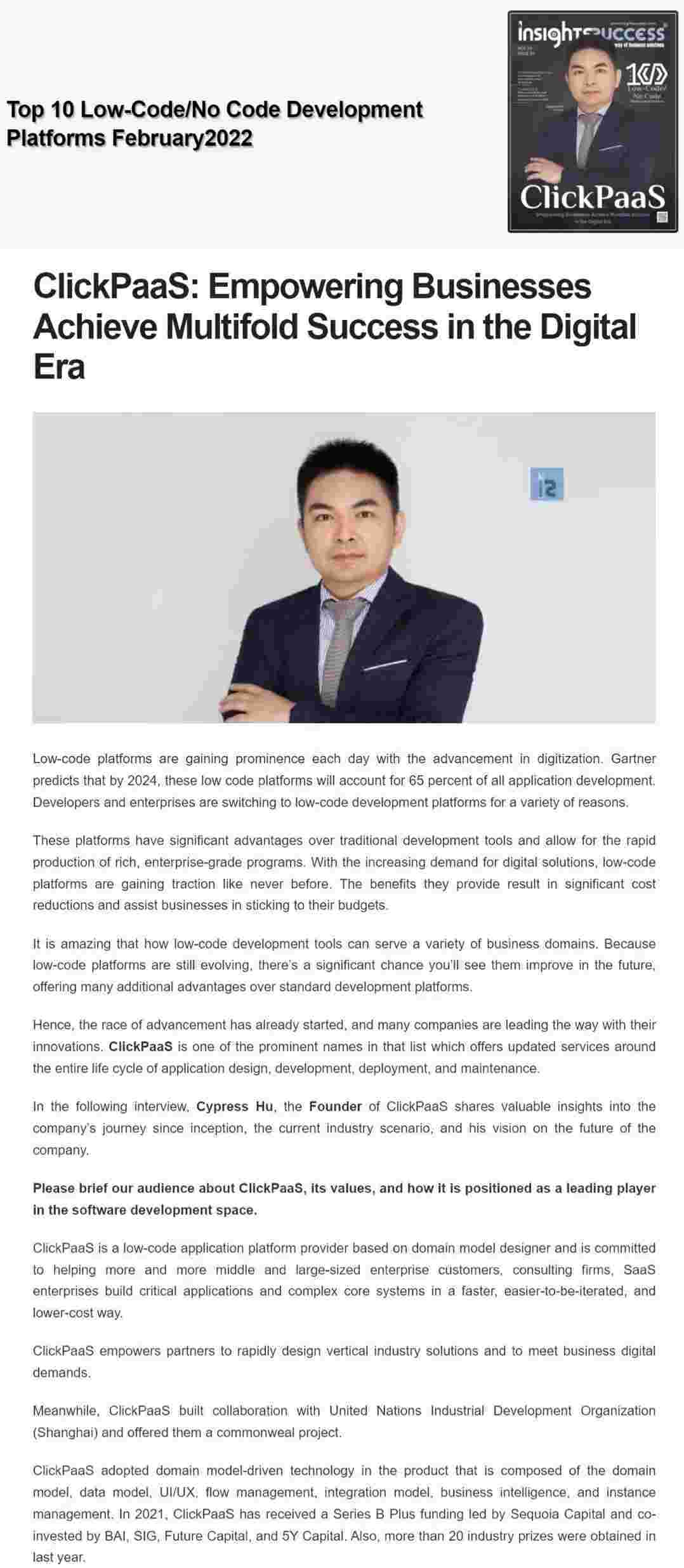 2022年年初,,钱能钱包入选外媒Insights Success低代码/无代码开发平台 Top10,,,创始人、、CEO胡柏受邀接受专访并荣登封面人物,,他与Insights Success的读者分享了钱能钱包成立的初心、、发展历程、、、当前的行业发展趋势以及他对公司未来的展望。。